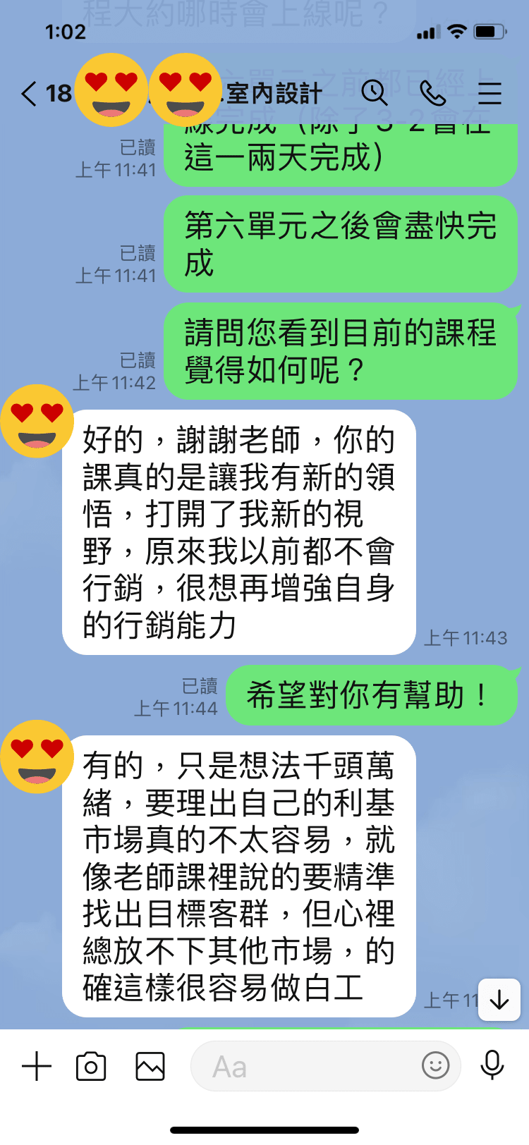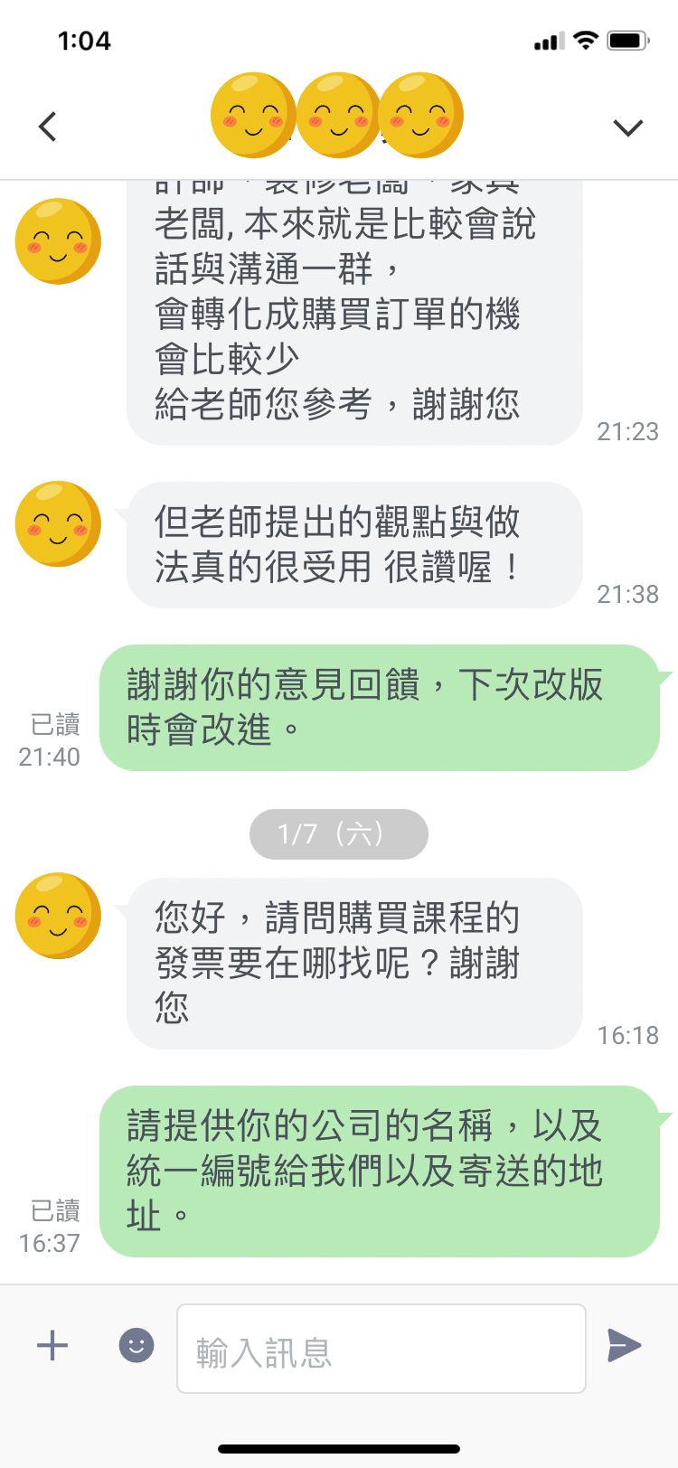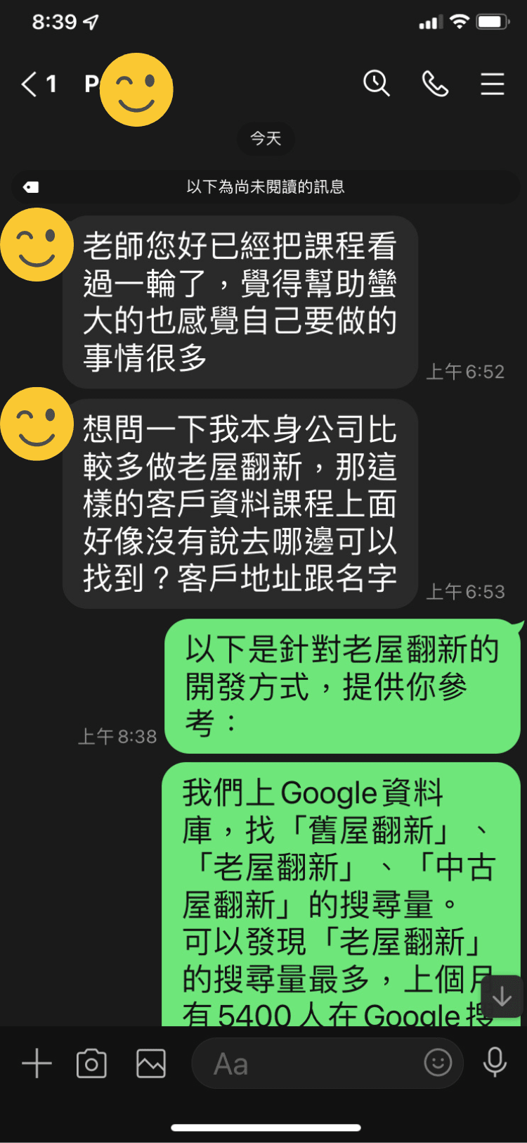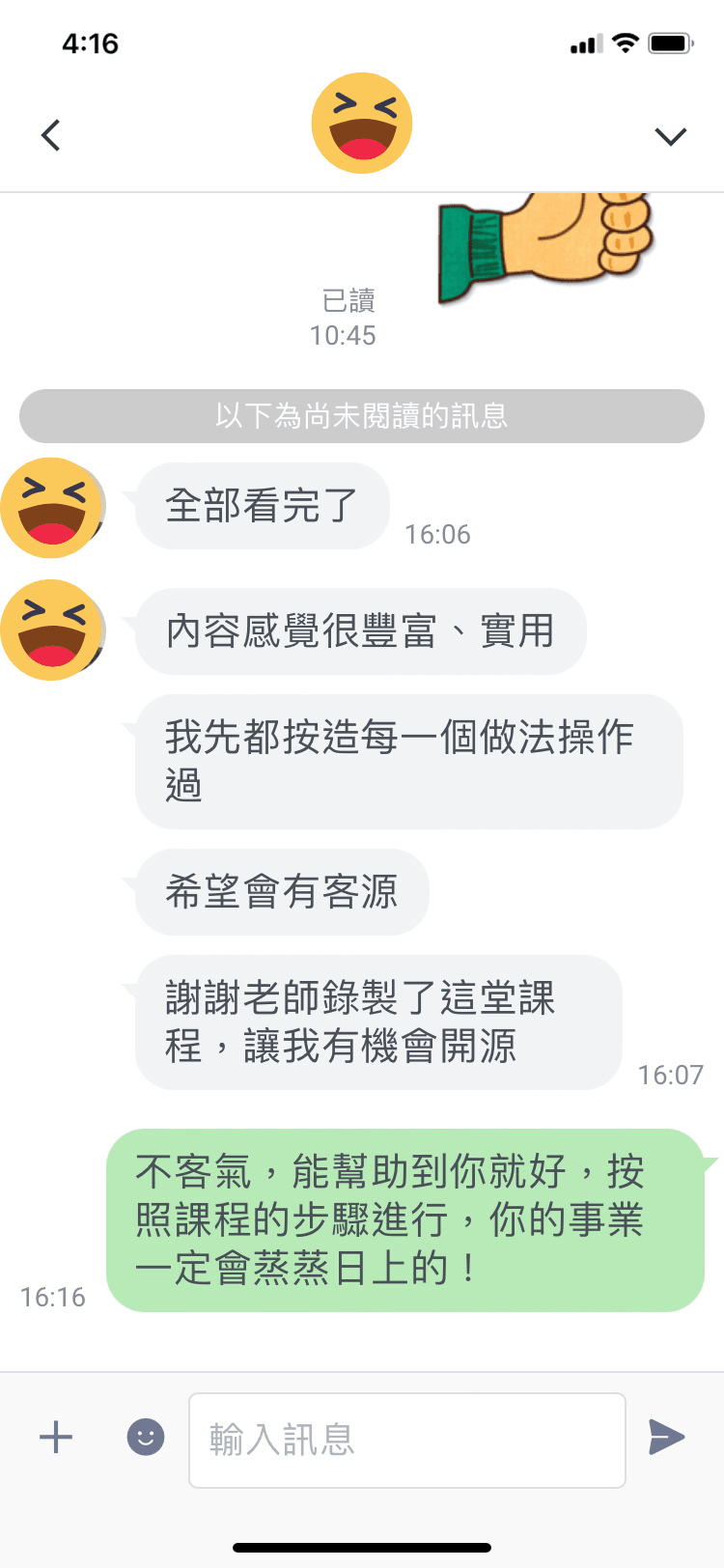 很喜歡這個課程,因為它的邏輯很清晰,並且提供善用網路資源為營業工具的方法,這些都是開發者的經驗整合的寶貴知識,我覺得很幸運且感謝開發者願意分享。