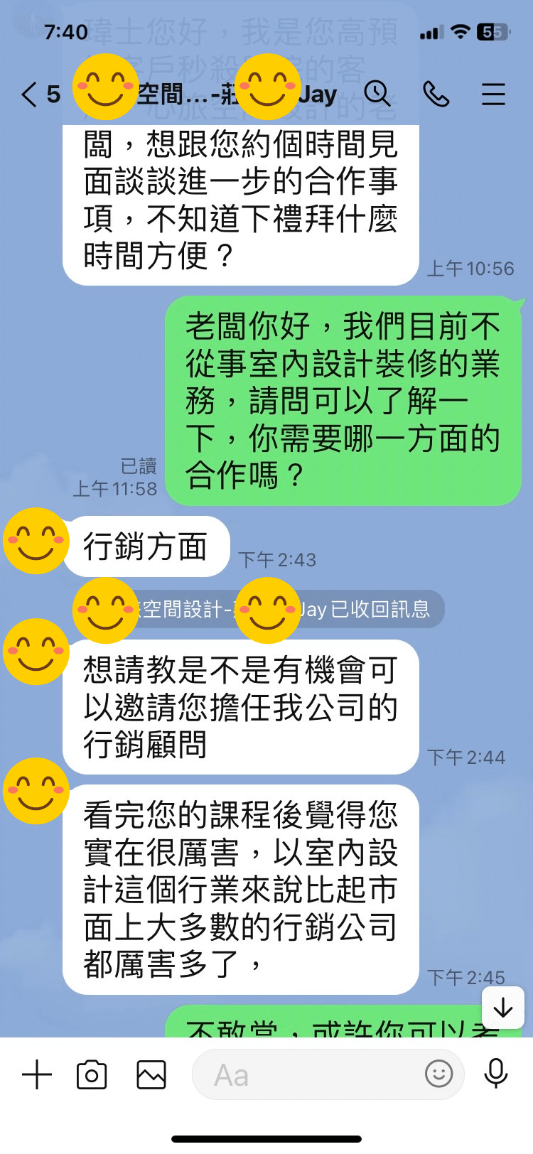 這個課程給予我了很多有關室內設計行業行銷的寶貴知識和技能。我學到了如何透過適當的產品展示和創意行銷策略,吸引潛在客戶的注意力。課程強調了設計與營銷的緊密結合,這令我深受啟發。