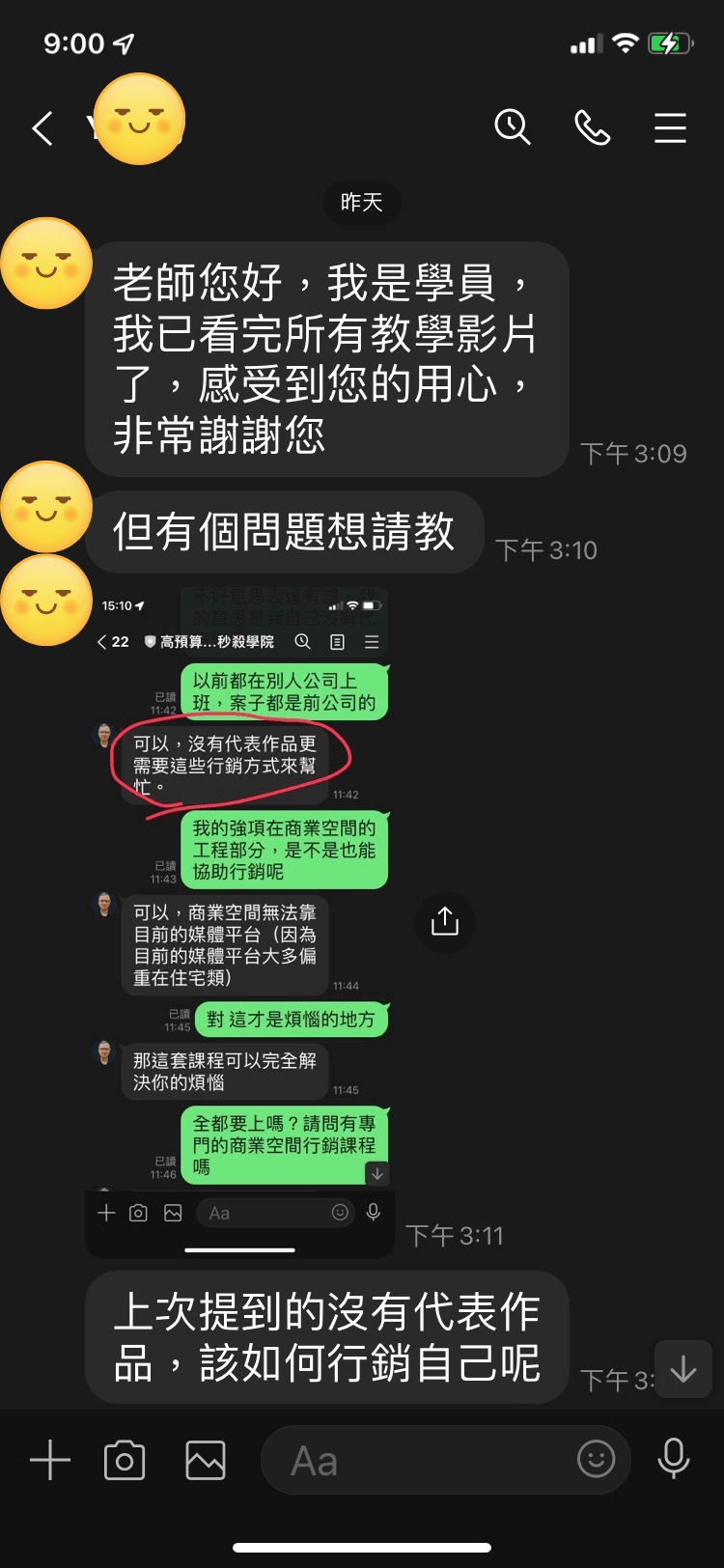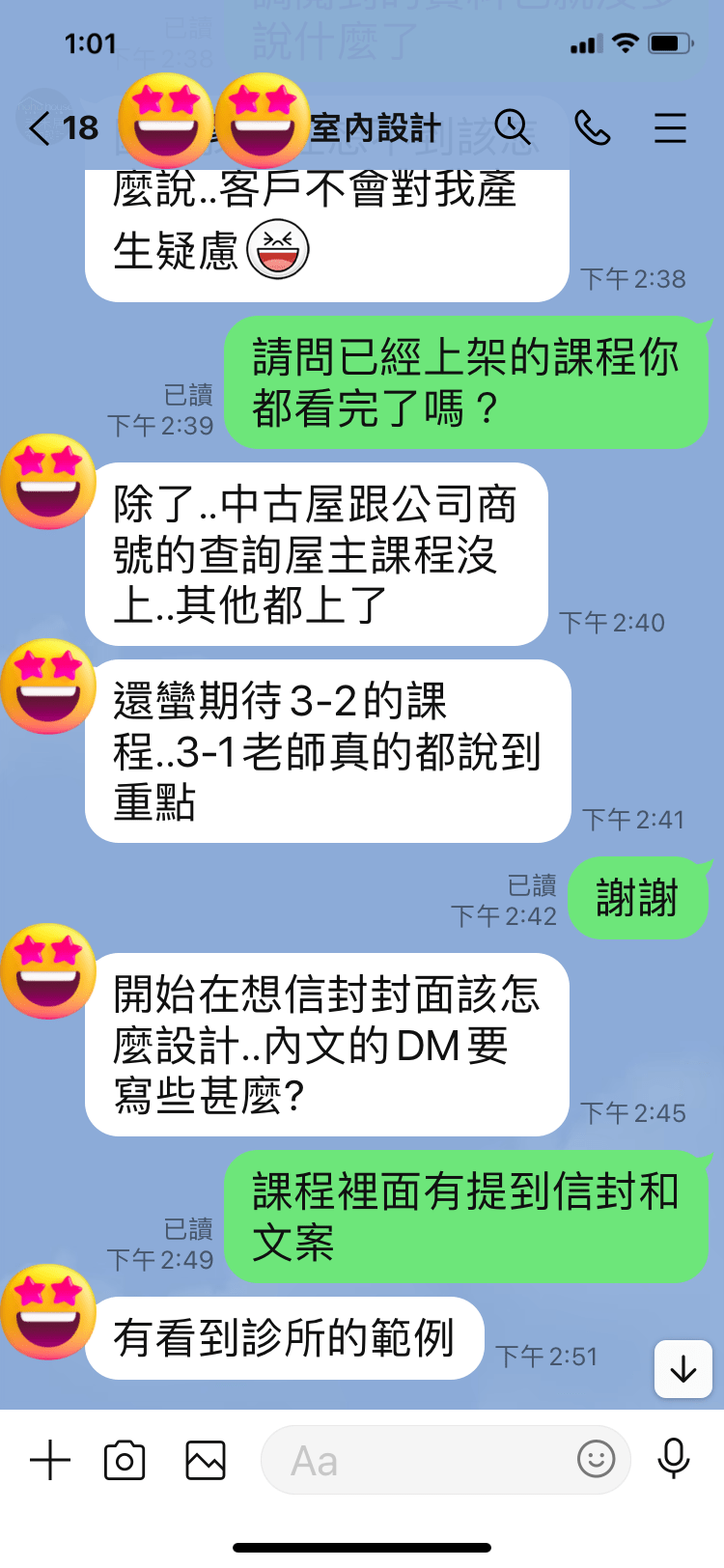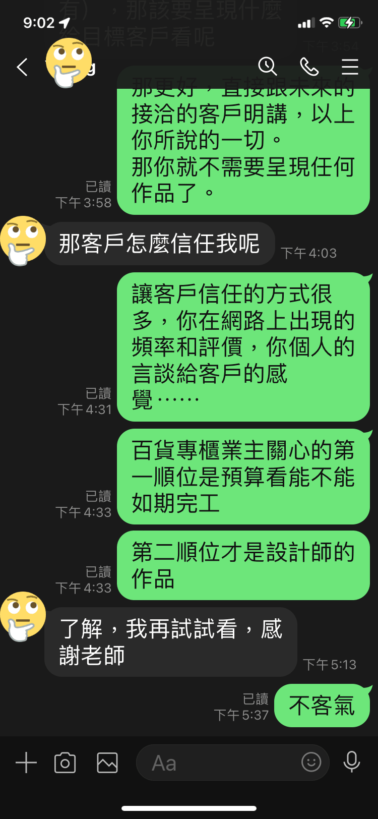 我覺得高預算屋主秒殺學院的講師真的非常用心,讓我們設計師不僅僅只會設計,而是讓我們更懂得如何去行銷自己的公司,很謝謝老師的教導。